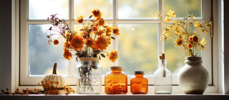 A bouquet of chrysanthemums in a vintage ceramic jug, a craft box, a candle on the windowsill with an autumn view outside the window. Cozy home interior