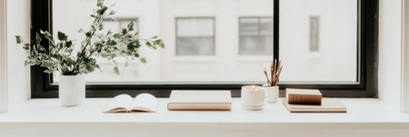 Home windowsill with lit candles and stacked books, minimalistic calm atmosphere, AI generated