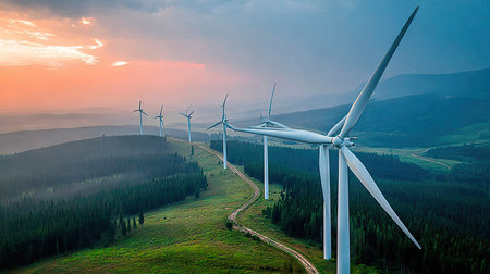 The image features wind turbines standing on a green hill with a path meandering through them. The sky displays a gradient of colors from orange to blue, suggesting sunset. The composition is expansive, offering a perspective on renewable energy and environmental conservation. This image is suitable for illustrating themes of sustainability and green technology.