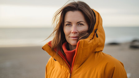 Portrait of a woman in a yellow jacket on the beach.