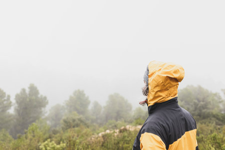 Woman in raincoat enjoying mountain landscape under rain, back view