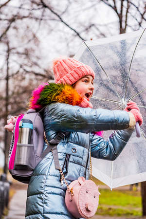 girl in a jacket with a transparent umbrella in the rain in the cold. Teenager under an umbrella