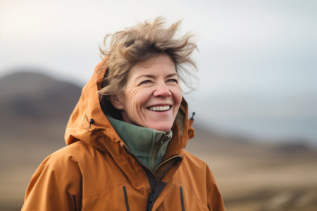 Portrait of a smiling senior woman in a raincoat on the nature