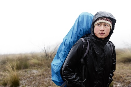 portrait of asian hiker with waterproof gear and backpack in the rain while trekking on an adventure expedition in the mountains during bad weather, cold and miserable