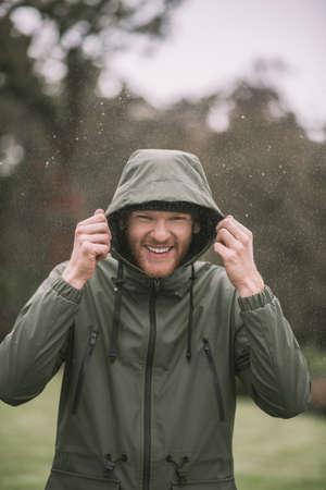 Heavy rain during autumn day. Portrait of young man in waterproof jacket.