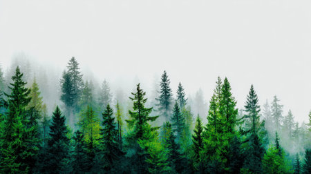 An atmospheric landscape features tall evergreen trees shrouded in thick fog. The scene is dominated by shades of green and gray, with soft lighting and a blurred background. Suitable for a variety of uses including environmental, travel, and natural beauty themes.