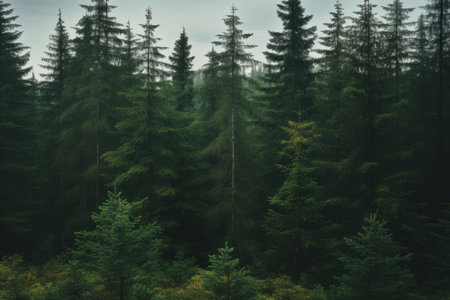 An overhead view reveals a dense forest canopy composed of numerous tall evergreen trees. The scene showcases a variety of green hues, with textures of needles and branches. The composition is framed by subdued lighting. The image suits commercial and editorial applications to depict nature or environment.