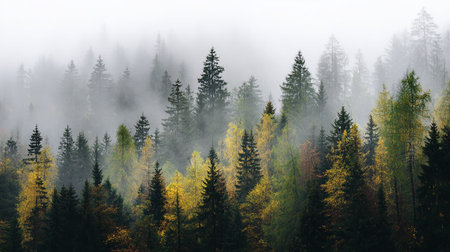 Discover a captivating misty forest landscape featuring tall evergreen trees enveloped in soft fog. This serene scene evokes tranquility and natural beauty, ideal for nature lovers.
