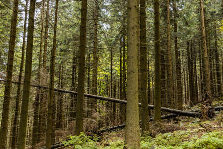 Fallen high old thin trees in forest in Rudawy Janowickie mountains