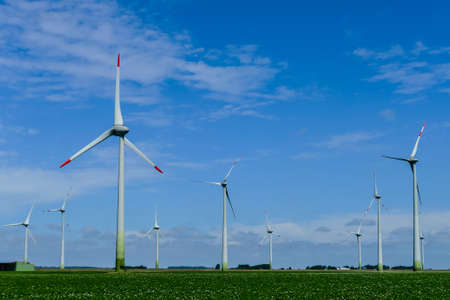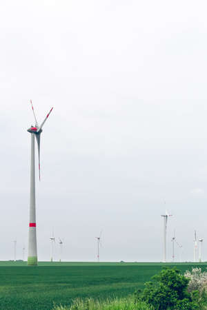 Eolian farm renewable energy in fresh green field against clear blue sky
