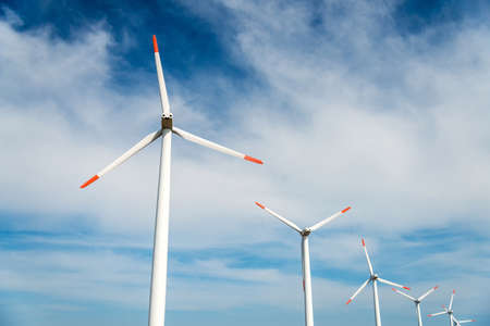 Wind turbines against a blue sky generating electricity - concept of sustainable development