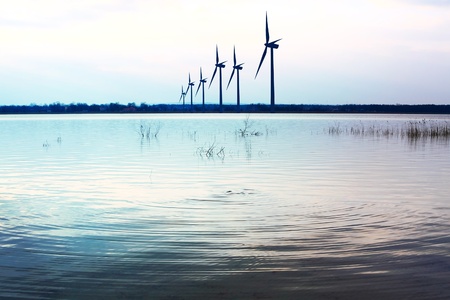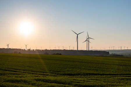 Landscape with modern wind turbines just before sunset lakes in Germany