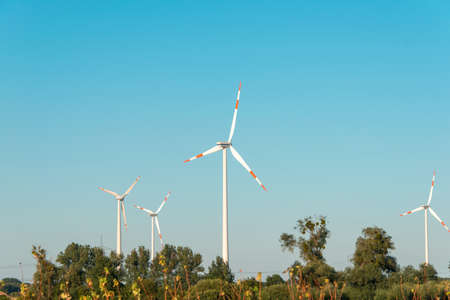 Yard of windmill power generator under blue sky. Eco power. Wind turbines generating electricity. Ecological power with windmill on the field.