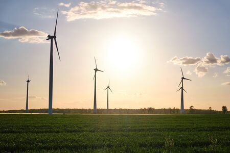 Wind Turbines In Rural Landscape At Sunset. Green renewable and alternative energy concept