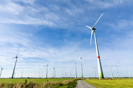 DORNUM, GERMANY - OCTOBER 10, 2019: Enercon wind turbines in a field with blue sky