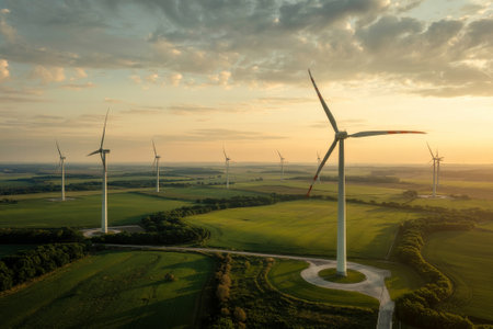 Golden hour illuminates expansive fields and majestic wind turbines, creating a harmonious blend of nature and renewable energy under a colorful sky.