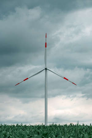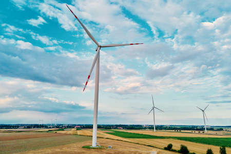 Windmill among agricultural fields. Wind turbine generator at summer day. Wind energy concept, Suistanable and renewable energy for climate protection