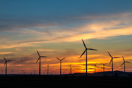 wind power generators, line of wind power generator spinning in sunset