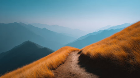 A breathtaking mountain landscape featuring a winding path surrounded by golden grasses. This peaceful scene showcases majestic peaks and a clear blue sky.