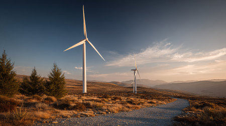 Tranquil landscape featuring wind turbines harnessing wind power for sustainable energy production.