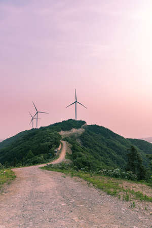 Beautiful sunset in the mountains with green grass and windmills