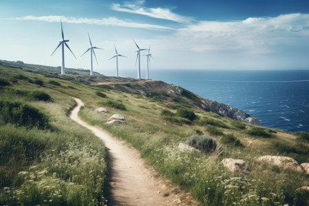 Wind turbines on a hillside with a path leading to the sea, View from Cape Kaliakra to an offshore wind farm in Bulgaria, AI Generated