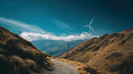 A breathtaking view of a wind turbine standing amid rugged mountain terrain, with a winding path leading through the golden grasses under a vast blue sky.