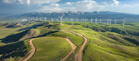 An aerial perspective shows verdant hills dotted with wind turbines. Lush green vegetation and pathways wind through the landscape under a dramatic, overcast sky. The natural lighting highlights textures. Suitable for illustrating renewable energy or environmental conservation. Ideal for editorial and commercial applications.