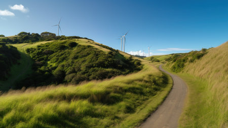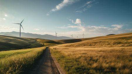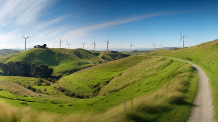 An AI generated scenic landscape with wind turbines against a lush green grassy field
