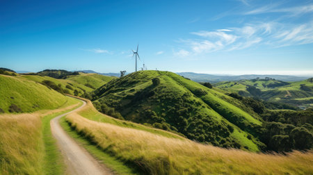 A scenic landscape showcases rolling green hills with wind turbines silhouetted against a cloudy sky. The composition emphasizes natural beauty with a winding path. The image features lush vegetation and a dramatic sky, suitable for environmental or energy-related visual content.