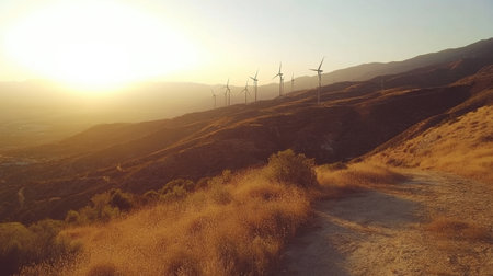 Scenic hilltop view of wind turbines lining mountain ridges at sunrise