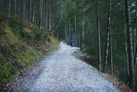 Eibsee lake, Garmisch-Partenkirchen, Bavarian Alps, Germany, 10.01.2015: people walking along the paths in the wood around Eibsee lake in Bavarian Alps during winter holidays