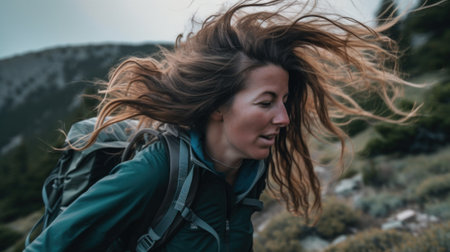 A woman with her hair blowing in the wind. Generative AI image.
