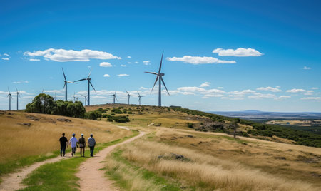 Sprawling wind turbines harvest clean energy across a vast field and tourists by bicycle