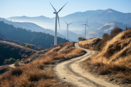 wind turbines stand tall at the ocean side, surrounded by misty mountainous vistas. the youthful energy of these fantastical machines is captured in the light gray and dark emerald style of the photo. the path made of dirt leads to a british topographical wonderland. shot at iso 200, this photo is a stunning representation of renewable energy. ai generated