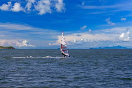 Windsurfing on the background of the deep blue sea landscape and clear sky.