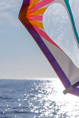 detail of a windsurf sail with a sea at the background - useful as a background - focus on the sail
