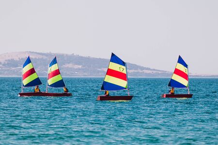 A fleet of vibrant sailboats with colorful sails racing on the blue water of the sea under a clear sky