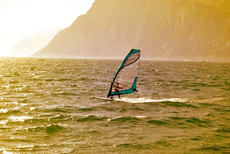windsurfer panorama silhouette against a sparking lake of Garda, in Trentino. Italy