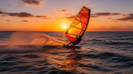 Windsurfer silhouette against a sunset background. Windsurfer Surfing The Wind On Waves, Recreational Water Sports, Extreme Sport Action. Sporting Activity. Healthy Active Lifestyle. Summer Fun.