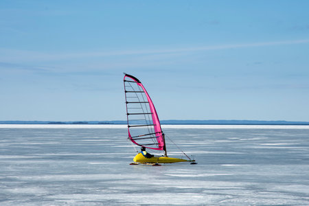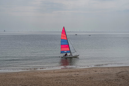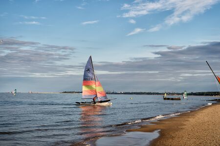 Gdansk, Poland - September 19, 2016: modern yacht or sailing boat or vessel sails with sailor by wind on sea water waves surface inshore on blue sky