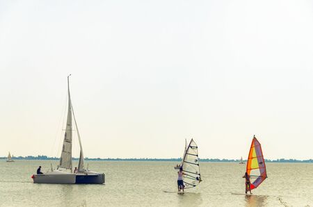Podersdorf am see, Austria - August 15 2015: Catamaran boat and two windsurfers on neusiedler lake in cloudy summer day