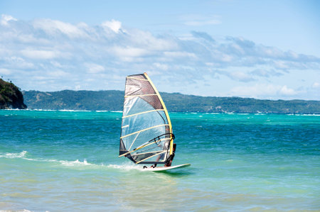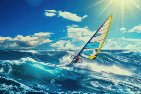 A person skillfully rides a surfboard on the ocean waves, experiencing the thrill and joy of the sport, Windsurfer gliding on the beautiful blue sea, AI Generated