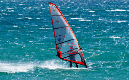 the windsurfer on the board under sail moves at a speed along the surface of the sea, against the background of waves and shoreline, windsurfing in the Red Sea