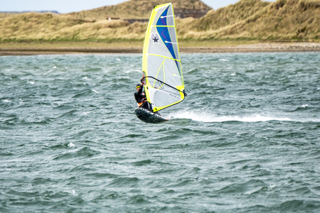 Caernarfon / Wales - May 01 2018 : Man windsurfing close to the town