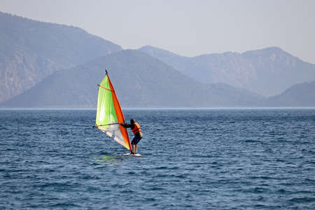 Windsurfing in the sea, water sports. View to windsurfer and green mountains in mist