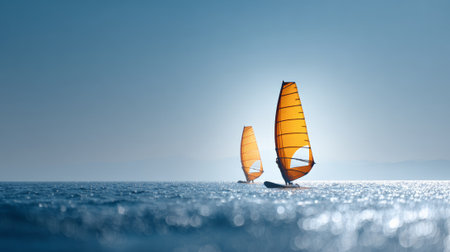 Two windsurfers gliding across vibrant blue water, their orange sails catching the sunlight on a stunning sunny day with a clear sky, embodying the essence of summer sports and adventure