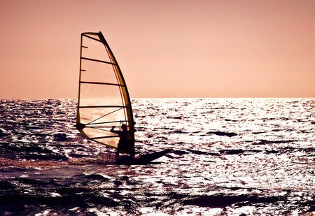 Sunset over the sea or ocean and extreme freestyle sport windsurfing, France, Giens
