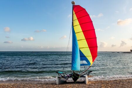 A beautiful white catamaran with red and yellow and blue sail and equipment is on the gold beach on the wet sand by turquoise sea on the sky with clouds background.