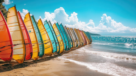 A vibrant beach scene with colorful windsurfing boards lined up, ready for use, highlighting the preparation and excitement before hitting the water.
